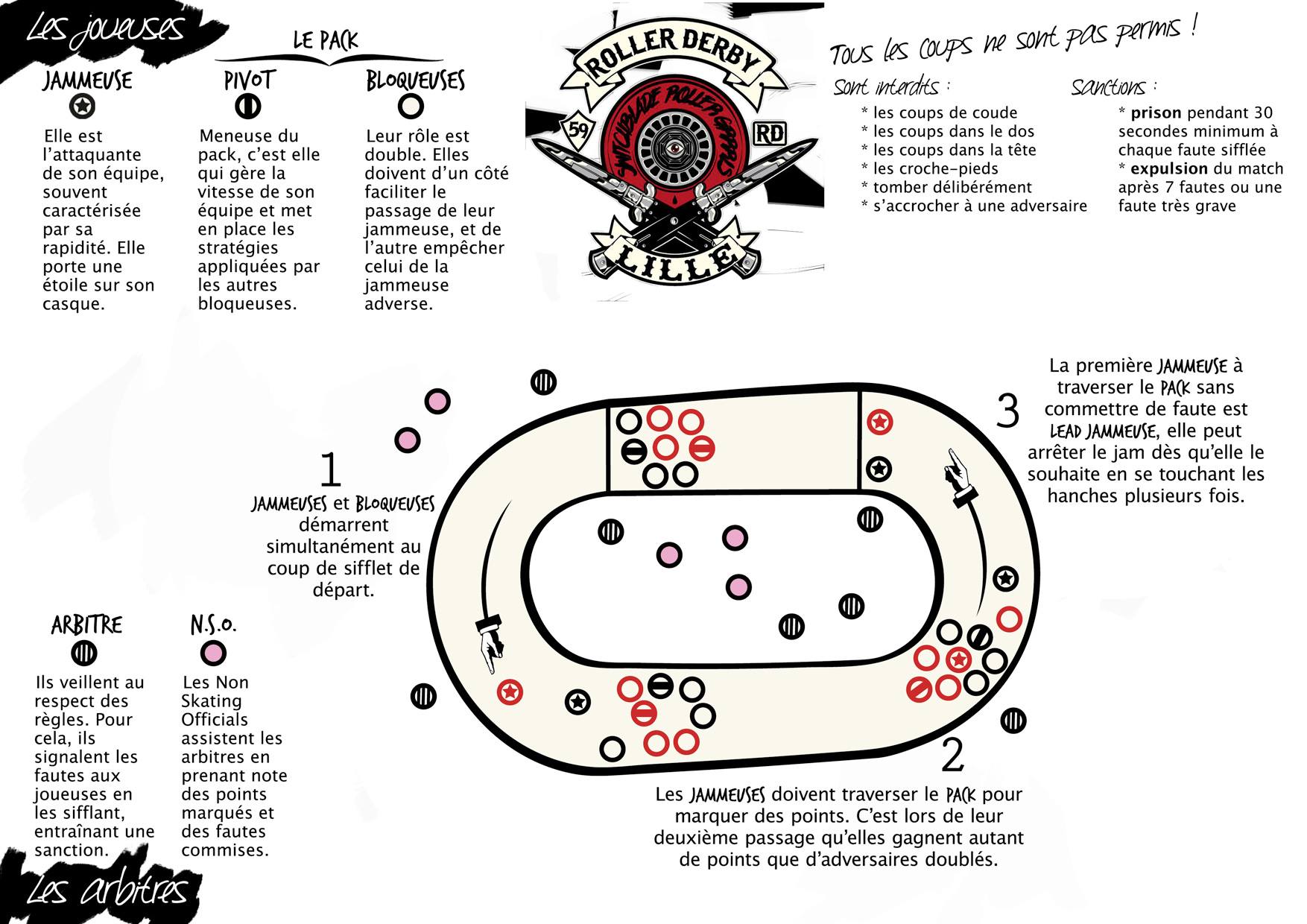 Un match de roller derby oppose deux équipes sur une piste circulaire et dure une heure. Chaque équipe est composée d’une jammeuse, de trois bloqueuses, et d’un pivot. Le but est, pour la jammeuse, de dépasser le pack des joueuses de l’équipe adverse en un minimum de temps. Le pivot doit gêner la stratégie du pack de l’équipe adverse afin de faciliter le passage de sa jammeuse. Quant aux bloqueuses, elles doivent à la fois favoriser le passage de leur propre jammeuse, tout en empêchant l’autre de se faufiler. C’est donc un sport très stratégique dans lequel se mêlent vitesse et contacts.